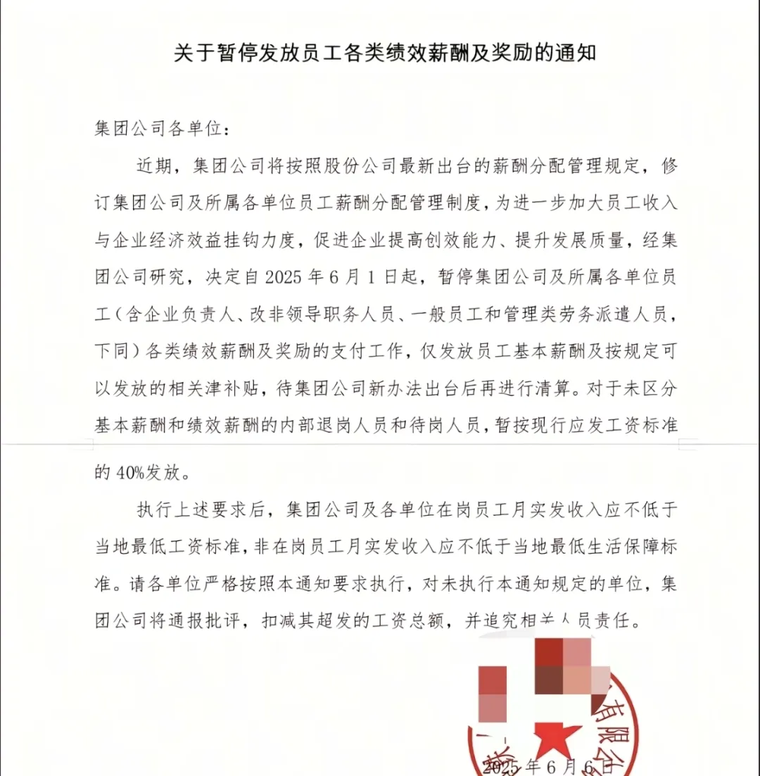 近期,集团公司将按照股份公司最新出台的薪酬分配管理规定,修订集团公司及所属各单位员工薪酬分配管理制度,为进一步加大员工收入与企业经济效益挂钩力度,促进企业提高创效能力、提升发展质量,经集团公司研究,决定自2025年6月1日起,暂停集团公司及所属各单位员工(含企业负责人、改非领导职务人员、一般员工和管理类劳务派遣人员,下同)各类绩效薪酬及奖励的支付工作,仅发放员工基本薪酬及按规定可以发放的相关津补贴,待集团公司新办法出台后再进行清算。对于未区分基本薪酬和绩效薪酬的内部退岗人员和待岗人员,暂按现行应发工资标准的40%发放。