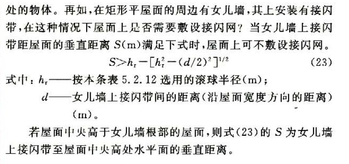 2、 若屋面中央高于女儿墙根部的屋面,则式(23)的S为女儿墙上接闪带至屋面中央高处水平面的垂直距离。