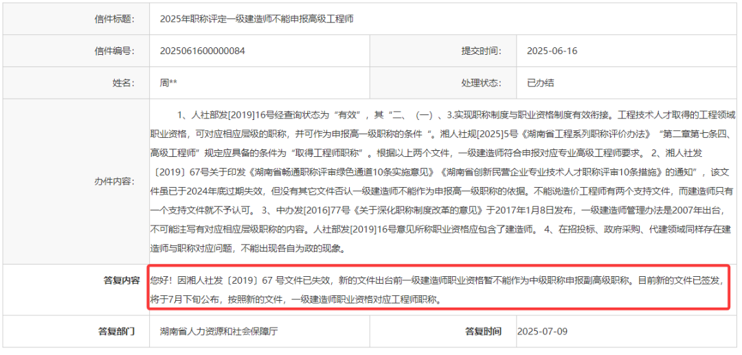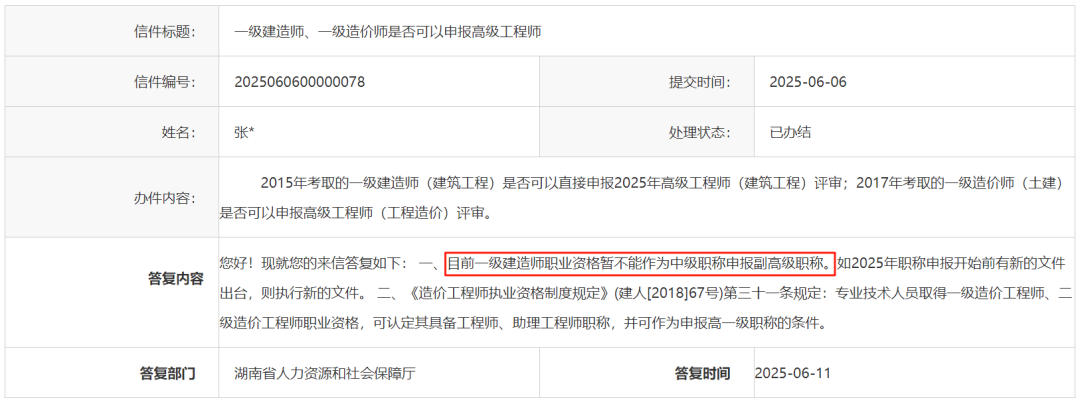 此前,湖南省人社厅在留言板回复:目前一级建造师职业资格暂不能作为中级职称申报副高级职称。