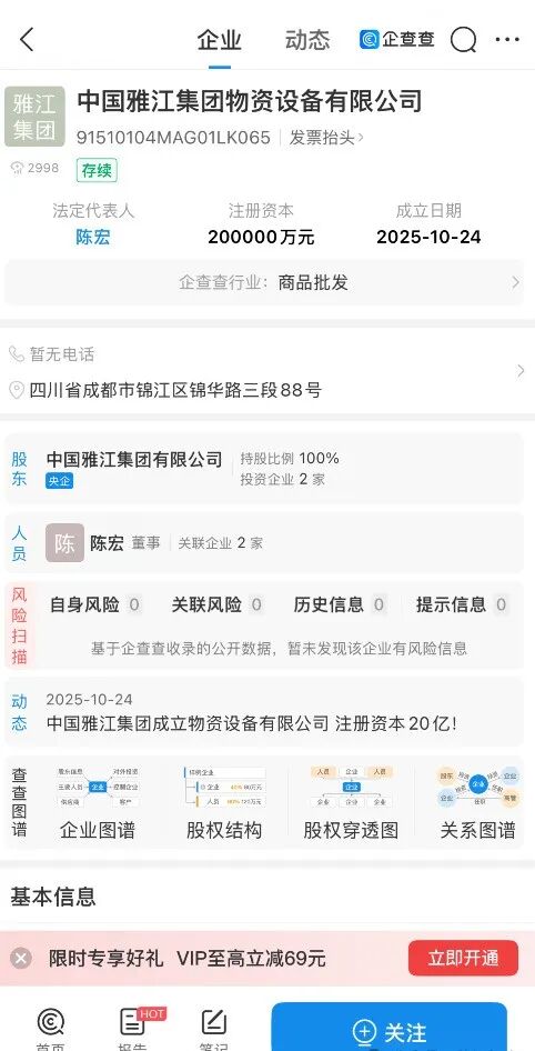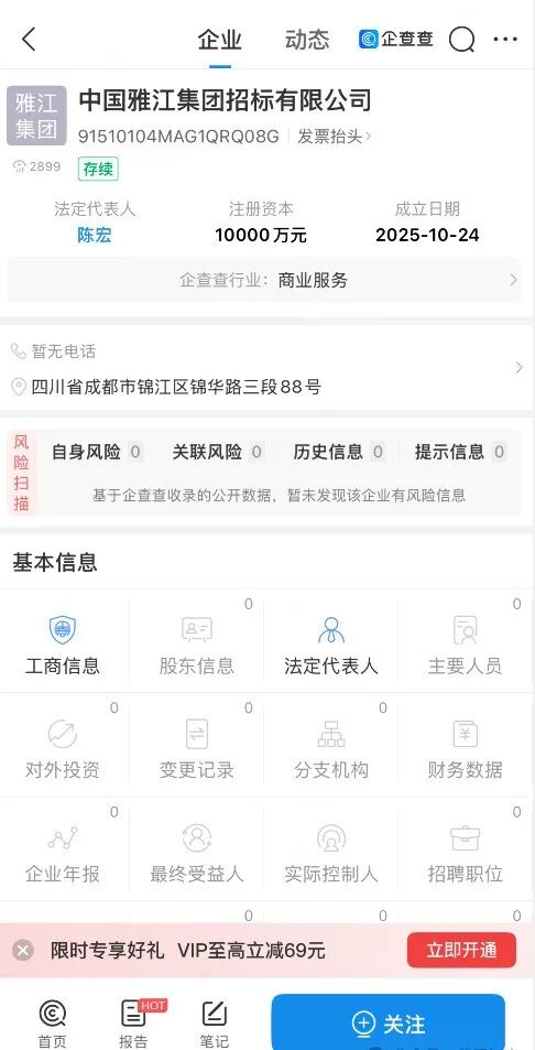 10月24日,中国雅江集团物资设备有限公司、中国雅江集团招标有限公司,注册成立,注册地址均位于成都市锦江区锦华路三段88号。
