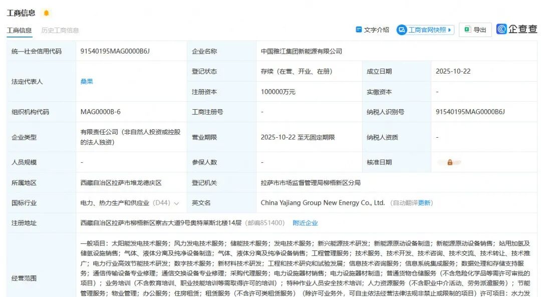 10月22日,中国雅江集团新能源有限公司注册成立,注册资本10亿人民币,注册地为西藏拉萨。