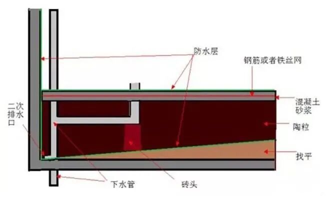 这里的“平”并不是水平的“平”,为了方便积水能够顺利的流入二次排水孔,下沉层的地面要做一个坡度,也就是二次排水孔的地方最低,然后其他地方缓缓升高。