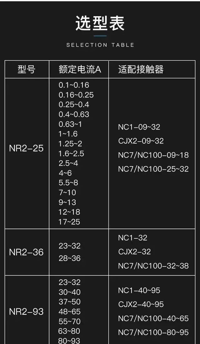 从上图可以看出,该品牌NR2系列热继电器的额定电流范围从0.1–93A,几乎涵盖所有中小功率电机。所以,不论什么功率电机都可以装配热继电器来实现过载保护。
