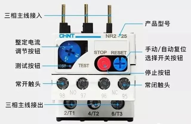 热继电器有主触头和辅助触头,主触头上分别标有L1/T1、L2/T2、L3/T3,辅助触头上面标有NO(常开)、NC(常闭)。