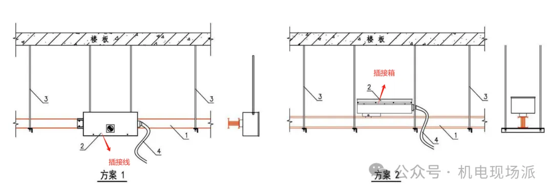 3、插接箱安装位置、高度准确,易于操作、固定牢固。插接箱侧装时应加装承重托臂或抱箍。插接箱安装禁止带电插拔。630A及以上插接箱需独立安装支吊架。
