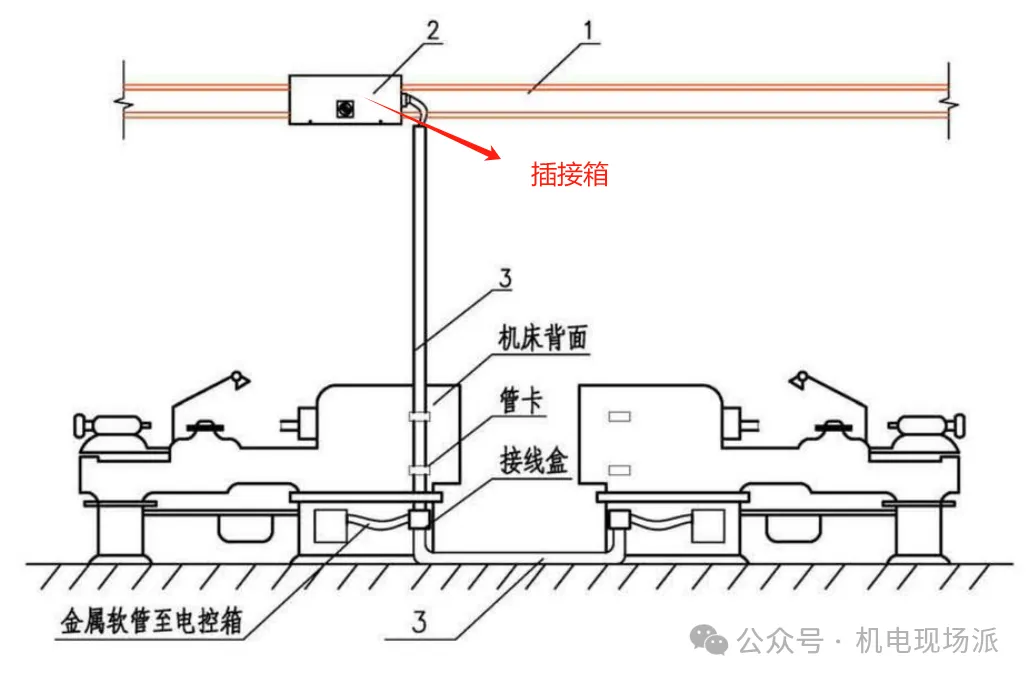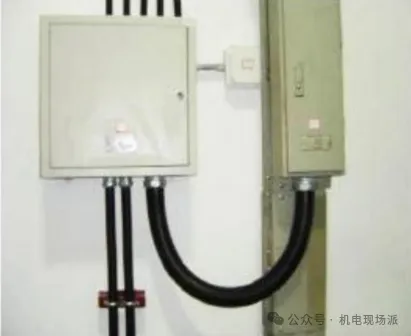 4、插接箱在垂直母线段的安装如下图。钢管与插接箱的连接应在箱壁内外各用螺母、垫圈将钢管与插接箱壁紧固在一起。钢管与母线的垂直(或水平)距离超过2.5m时应采取固定措施。
