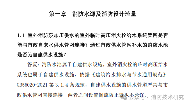 2025年6月,合肥市城乡建设局编制发布了《合肥市建设工程消防设计常见问题技术指南·给排水分册》。其中的第一章节的1.1条明确要求:消防临时高压给水系统属于自建设施供水,严禁与市政供水管网连接。具体如下: