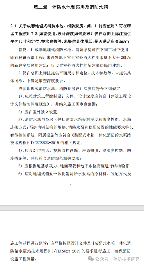 答复:1.成套地埋式消防水池、消防泵房可在下列工程中使用:既有建筑改造工程;未设置地下室且室外消火栓用水量不大于 30L/s的新建多层民用建筑;仅设置室外消火栓的新建多层民用建筑。