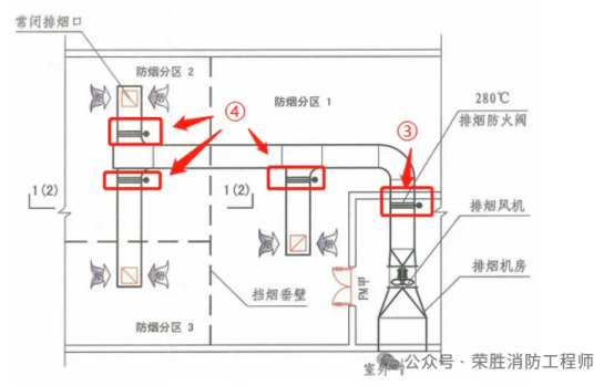 排烟防火阀是设置在机械排烟管道上的,平时常开,火灾时温度达到280℃时关闭。具体位置为:(分支入口见水平)