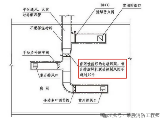 ②在机械排烟系统中,存在于排烟与通风空调系统合用的情况下,电动风阀平时常开,火灾时电动关闭,并且每个排烟合用系统的管道上需联动关闭的通风和空气调节系统的电动风阀不应超过10个