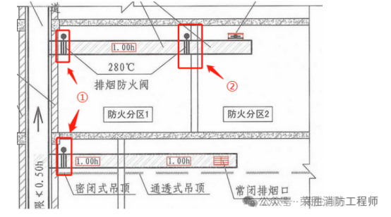 注意:上面两句话中的数字,很多同学只是记忆了一个大概,认为说的是一回事,只是不同规范数据不同,其实不然!200mm说的是排烟防火阀与墙端面的距离,而2.0说的是排烟防火阀两侧2.0m范围内风管的耐火要求,大家注意区分。