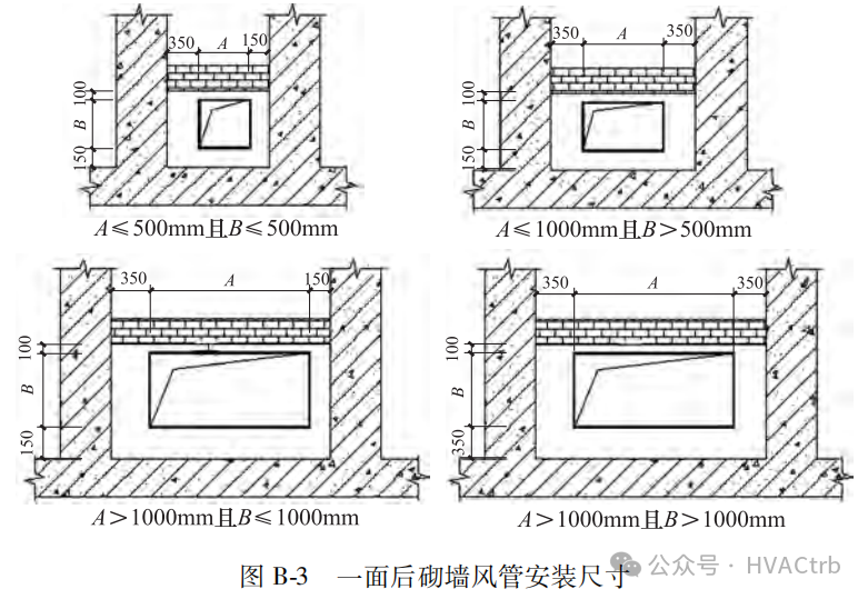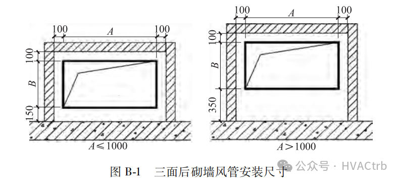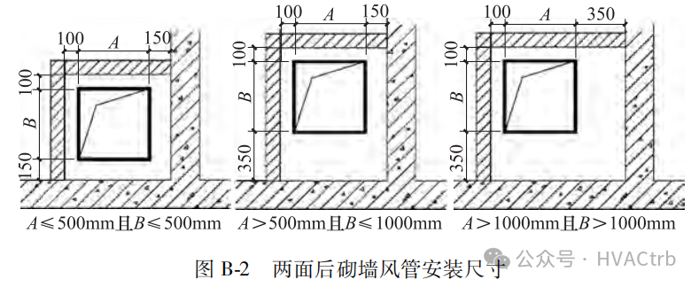 3)风管截面长度和宽度均超过1000mm,风管距墙之间的尺寸均应不小于 350mm,满足安装人员进入风管与墙壁之间的空间进行风管安装,如图 B-2。