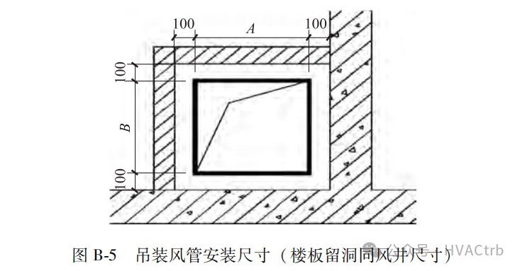 当竖向井道高度不超过30m时,有条件在风井顶部无墙区域进行风管连接后从上部深入竖井,到位后再做固定,此时风井内风管与混凝土墙距离不小于 100,与后砌墙距离不小于 100mm即可,如图 B-5。