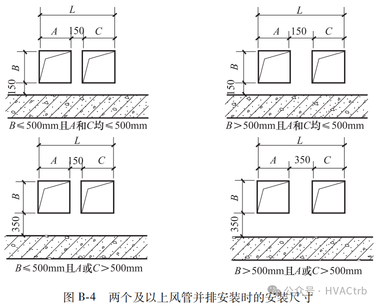 一个竖井内设置多个风管时,风管间距及风管距墙的距离也应按上述原则确定,如图 B-4。