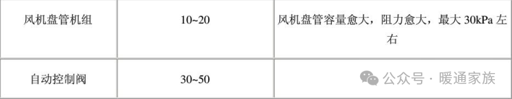 ③、空调未端装置阻力:末端装置的类型有风机盘管机组,组合式空调器等。它们的阻力是根据设计提出的空气进、出空调盘管的参数、冷量、水温差等由制造厂经过盘管配置计算后提供的,许多额定工况值在产品样本上能查到。此项阻力一般在20~50kPa范围内。