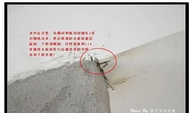 决窍在这里,两条切割线。梁体与墙结合部要敲掉一定抹面层