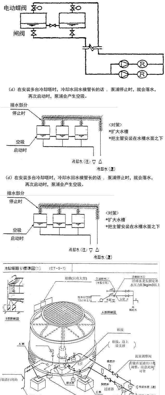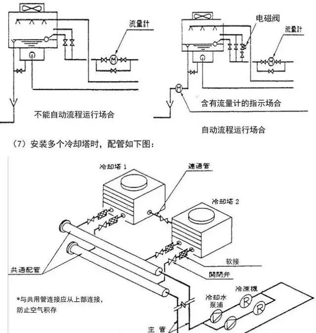 1)冷却水管配管应向冷却塔倾斜,但是在鸟居配管场合,应设自动或手动排气阀。