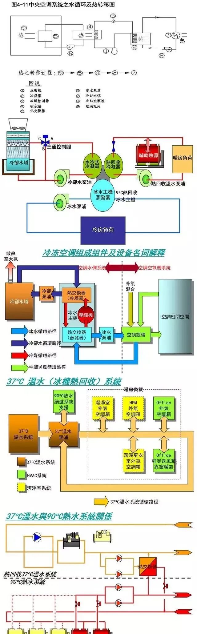 2)冷却水管路:输送冷却水到冷凝器(CONDENSER)以便冷却冷凝器。即使用冷却水泵浦推动冷却水到冰水主机之冷凝器完成热交换,复将冷凝器产生之热水送到冷却水塔散热。
