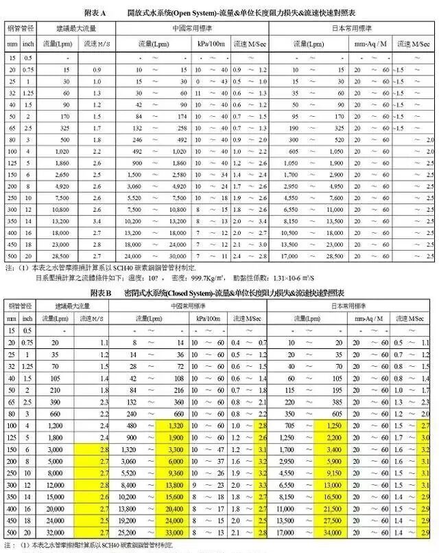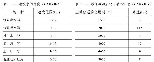 3)良好的设计需在设置成本与运行成本之间取适当平衡点,一般冷温水配管单位摩擦损失建议在60mmAq/M以下,平均40mmAq/M,管内流速在2M/S以下,同时参考配管侵蚀防止(以年间运转时间作比较)之最高流速限制。
