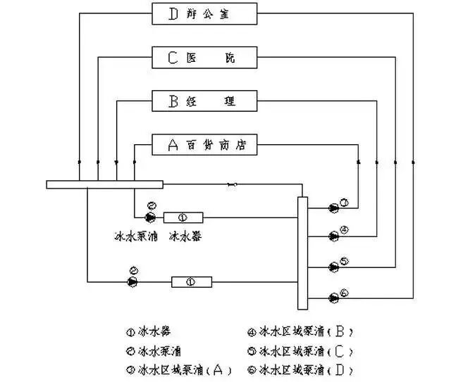 多用途建筑物为目前常见的建筑,配合业主及顾客之需要采用多角化的经营,不但建筑本体较大,而且建筑物的利用极为复杂,因此空调系统之设计必须按建筑物之用途及使用时间,利用冰水管路配合冰水泵浦加以区分为数个空调区域,再按冷气负荷的大小及空调区域的多寡来选择空调主机、冷却水塔及其他附属设备;如此可依空调区域的需要采取局部开机或全部开机。不但可收到减少冷气损失、节省可观的能源效果外,还可在空调设局部开机时,部份停用的设备获得休息及做好保养维护,而增加空调设备的寿命。(多用途建筑物冰水管路系统如图4—16所示)。