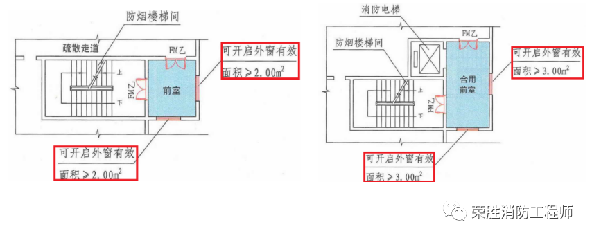 (3)梯无防前室强。此时要求其前室的开窗应设有两个及以上不同朝向的可开启外窗,且独立前室两个外窗面积分别不小于2.0m2,合用前室两个外窗面积分别不小于3.0m2