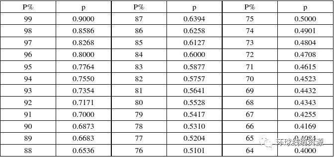 从下表中查找屏蔽密度对应的单向覆盖率p ,然后代入下式计算 W =π2