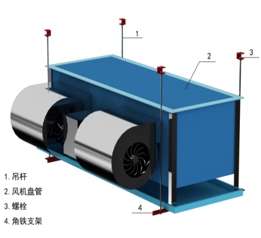 风机盘管安装需要单独为末端设备配置支吊架,采用底部托架时应避免遮挡末端装置下部检修口。