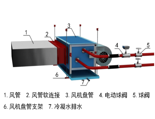 风机盘管安装时应与前段的支管有4倍直径的距离,端设备与风管可以采用插入方式连接,进风接管的直径应与末端装置接口直径相同,末端设备进出口连接均采用软连接。