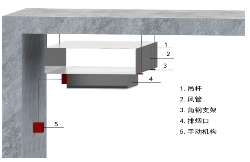 排烟口在吊顶安装时,排烟管道安装底标高距吊顶面的尺寸应大于250mm以上;排烟口操作装置的电气接线及控制缆绳采用DN20套管,控制缆绳套管的弯曲半径不小于250mm,弯曲数量一般不多于3处。