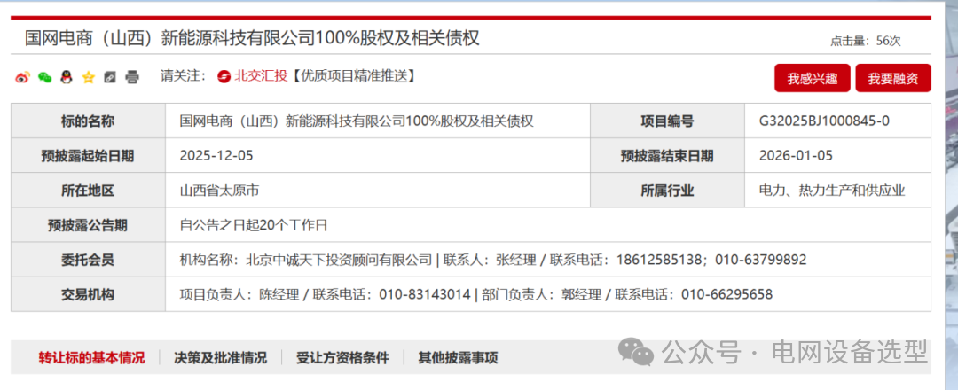 12月5日,北京产权交易所还预披露了国网电商(山西)新能源科技有限公司100%股权及相关债权公告、国网智联(吉林)新能源有限公司100%股权及相关债权,转让方也都是国网电商科技有限公司。