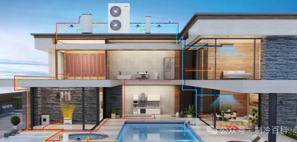 “三联供”中央空调相较于“二联供”,多了一项功能,即可以利用主机运行产生的热量来加热生活用水,从而同时满足空调制冷、地板采暖以及生活热水这三个方面的需求。
