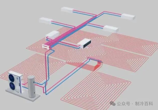 以夏天和冬天为例,在夏天,“二联供”中央空调的室外主机制造出冷冻水,冷冻水经循环系统流至风机盘管处进行热交换,随后将冷气吹出,为室内降温;到了冬天,室外主机产出热水,热水在专用采暖管道内循环流动,加热地面装饰层,通过地面辐射和对流的方式使地面温度升高,为室内供暖。