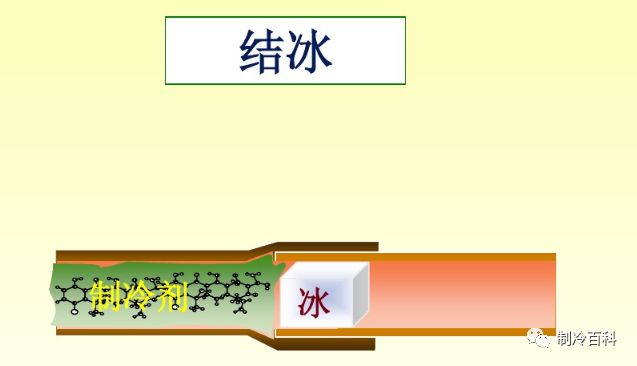 • 产生“冰堵”:在节流部件(如毛细管、电子膨胀阀)处,温度会急剧下降。水分在这些低温区域结冰,形成“冰堵”,堵塞制冷剂通道。表现为:机器一会儿冷一会儿不冷、高低压波动大、间歇性故障。