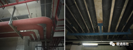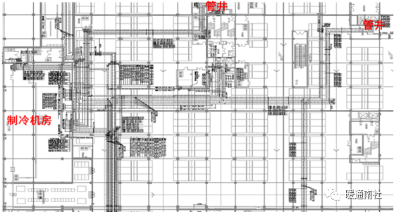 大直径管道及管道集中部位主要分布在地下室制冷机房、消防泵房、生活水泵房、换热站等部位,管道从机房出来后,水平吊挂在楼板下方,分段通往到竖向管井,通过竖向管井至地上各楼层。从机房到管井的管道水平路就是支架的最不利部位(冷冻机房中通往冷却塔的冷冻水管直径一般在500~800mm,应重点复核)。此处管线提供放大图。