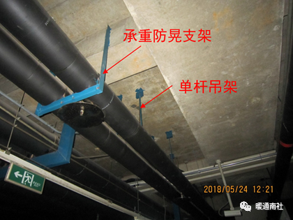 (8)冷(热)媒水、冷却水系统管道机房内总、干管的支吊架,应采用承重防晃管架,与设备连接的管道管架宜采取减振措施。当水平支管的管架采用单杆吊架时,应在系统管道的起始点、阀门、三通、弯头处及长度每隔15m处设置承重防晃支吊架。GB50243-20169.3.8