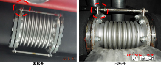 (5)空调水系统调试完毕后,需及时将冷冻水管的补偿器限位螺栓的内螺母松开,预留的变形量现场测量值与图纸要求值进行核对。