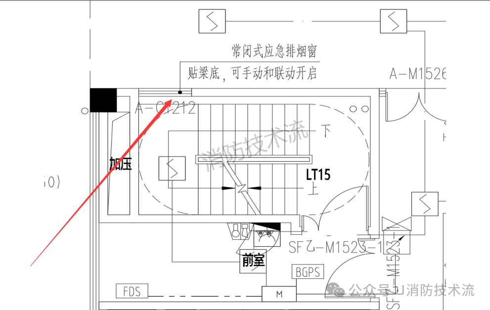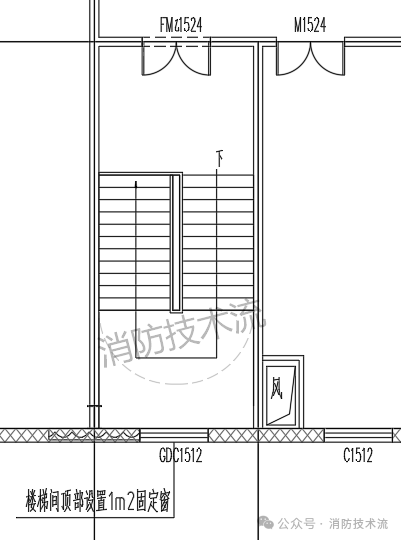 案例:某项目在加压送风楼梯间顶部设置固定窗,未设置常闭式应急排烟窗,设计违规。