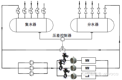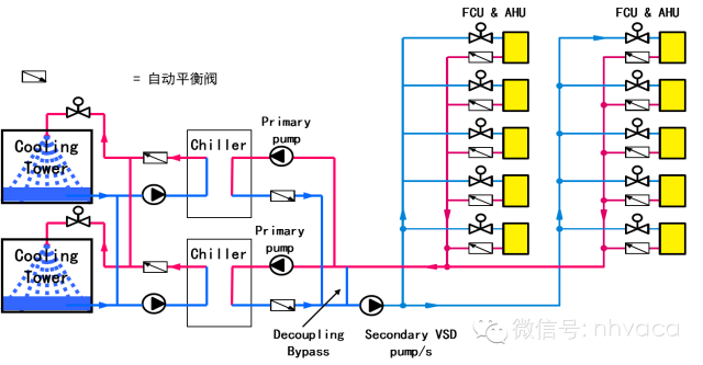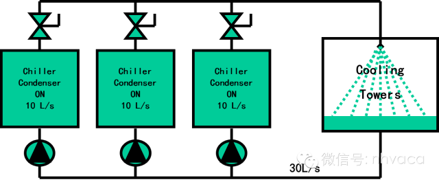 在没有自动平衡设备的条件下,即使每台冷冻机都安装一台泵,流量也会因为冷冻机分步启动而产生波动。