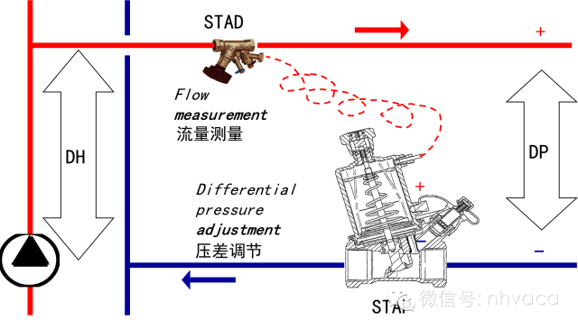 在需可调式动态流量平衡时采用静态阀与差压阀结合,对流量进行调节,主要用于重要分支管理及需精确调节的空气处理单元。