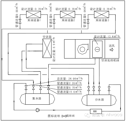另一方面三个末端设备、空调箱及空气处理机组的实际管道流量均等于设计流量。