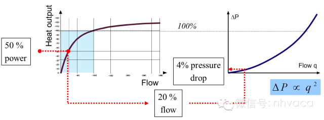 在50%热输出时,系统中流量只有设计流量的20%,压降降至设计压降的4%。