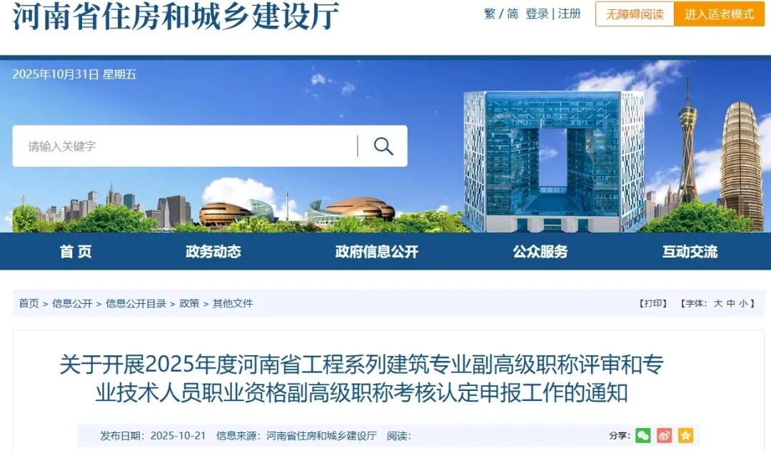 去年10月,河南住建厅发布了《关于开展2025年度河南省工程系列建筑专业副高级职称评审和专业技术人员职业资格副高级职称考核认定申报工作的通知》。