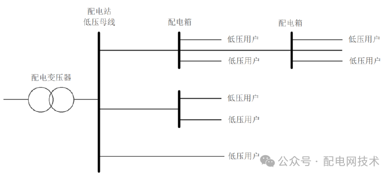 低压配电网(220 V/380 V)电网结构示意图如下图所示,采用辐射式接线方式。