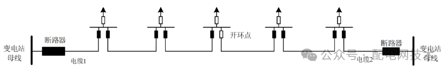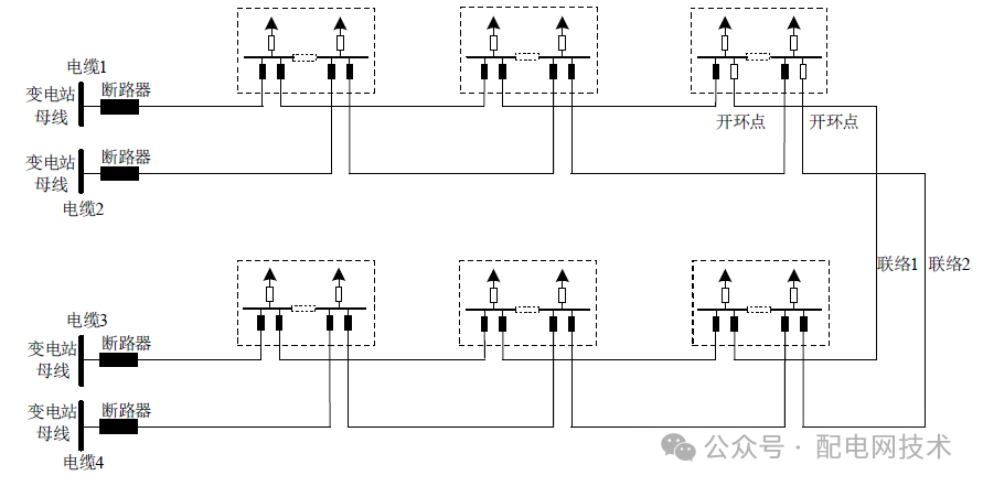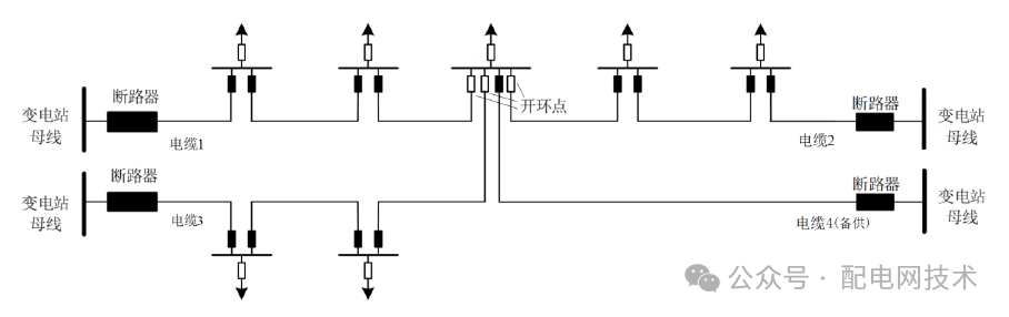 自不同上级电源的中压母线引出两到四回电缆线路构成单环网,如下图所示(示意图为典型“2-1”单环网)。