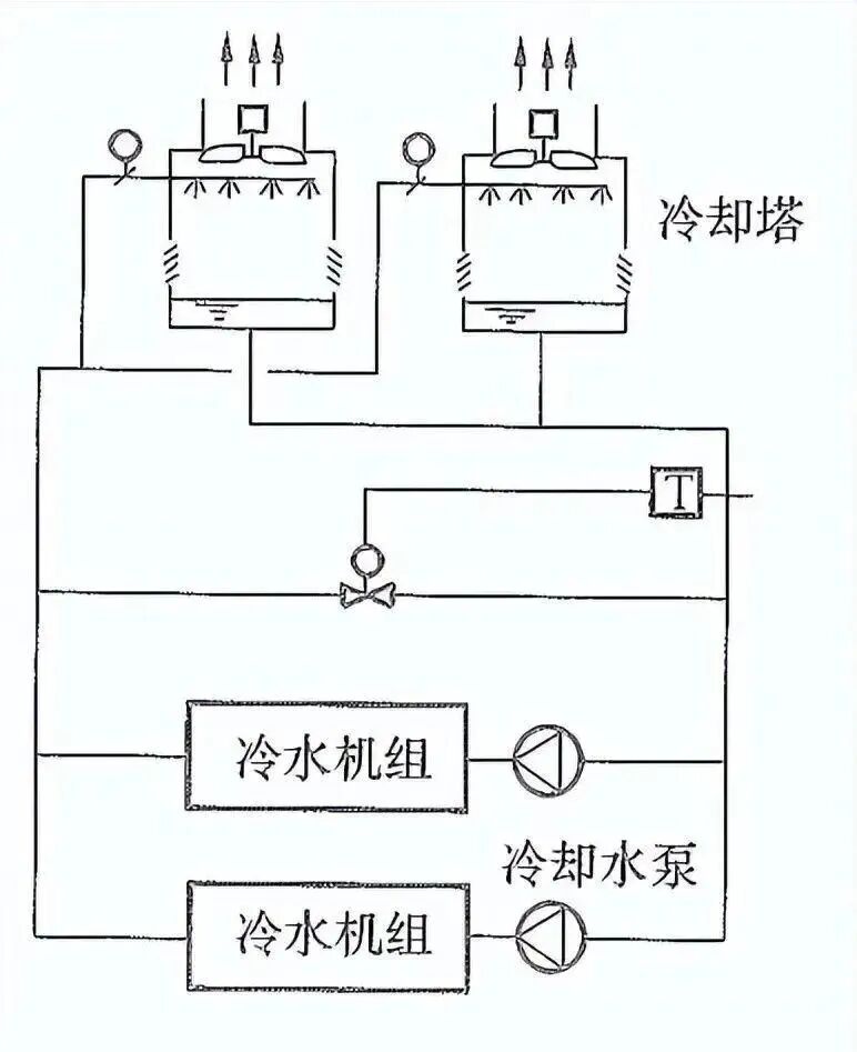如下图所示,通过设定的冷却塔出水温度,控制供回水管之间的旁通阀,可实现上述要求。此方法与冷水系统的压差旁通控制法有类似之处,但水力工况不完全相同。