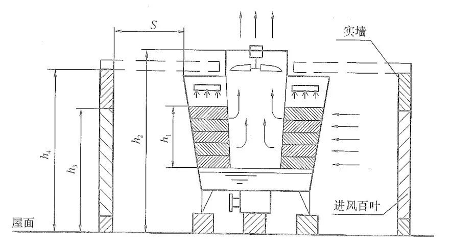 a、进风风量保证措施。如上图所示。当遮挡物为实体墙时,为了保证风量,遮挡物与冷却塔边缘的间距应满足S≥h的要求,使得从冷却塔与周围墙之间的空间上部进风的空气流通面积不小于冷却塔本身的进风面积。如果小于,则应在实体墙下部开设进风百叶,进风百叶的净面积不应小于冷却塔本身的进风面积。