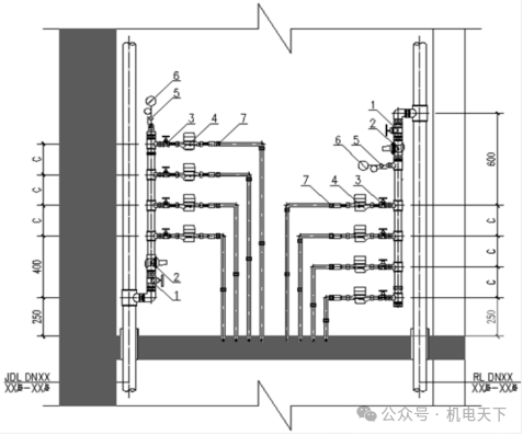 1)施工深化设计图纸应包括平面图及立面图,深化内容包括管道定位、水表组布局、 支架形式等。