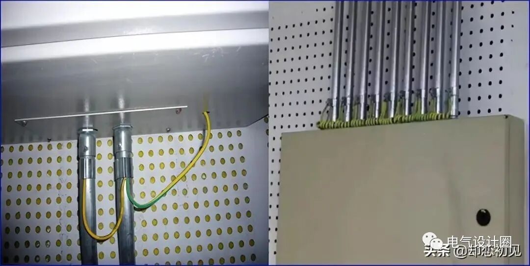 工艺要求:导管与箱之间用锁母固定,钢管接地跨接线引到箱内接地母排上。