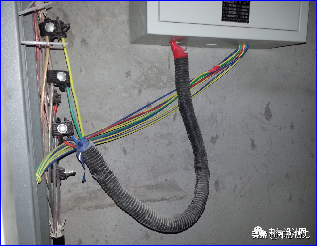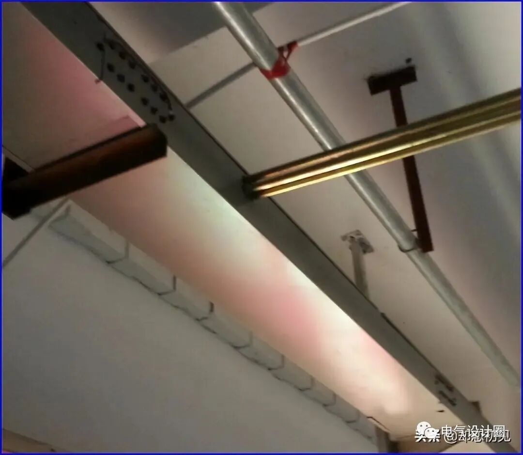 工艺要求:导管与箱之间用锁母固定,钢管接地跨接线引到箱内接地母排上。导管支架间距均匀、成排成线。塑封金属软管与箱之间用专用锁母固定,在插接母箱位置在母线槽外壳上粘贴马鞍卡固定软管,如采用金属软管则需做接地跨接。