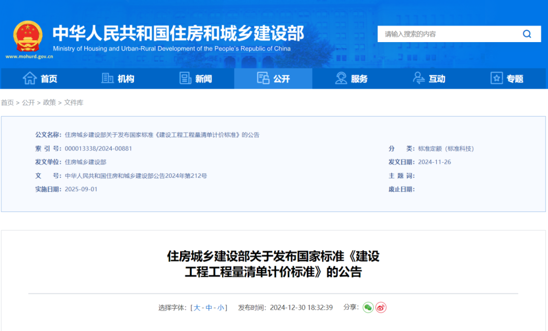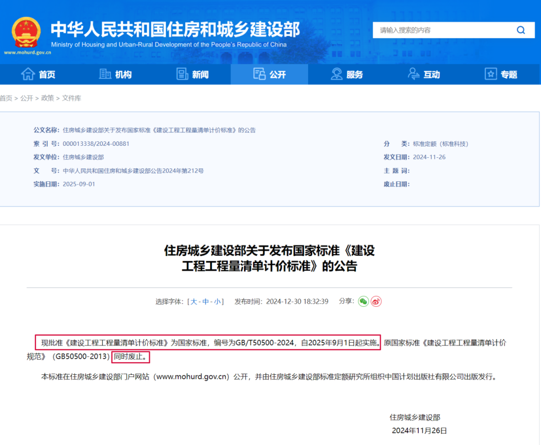 现批准《建设工程工程量清单计价标准》为国家标准,编号为GB/T50500-2024,自2025年9月1日起实施。原国家标准《建设工程工程量清单计价规范》(GB50500-2013)同时废止。